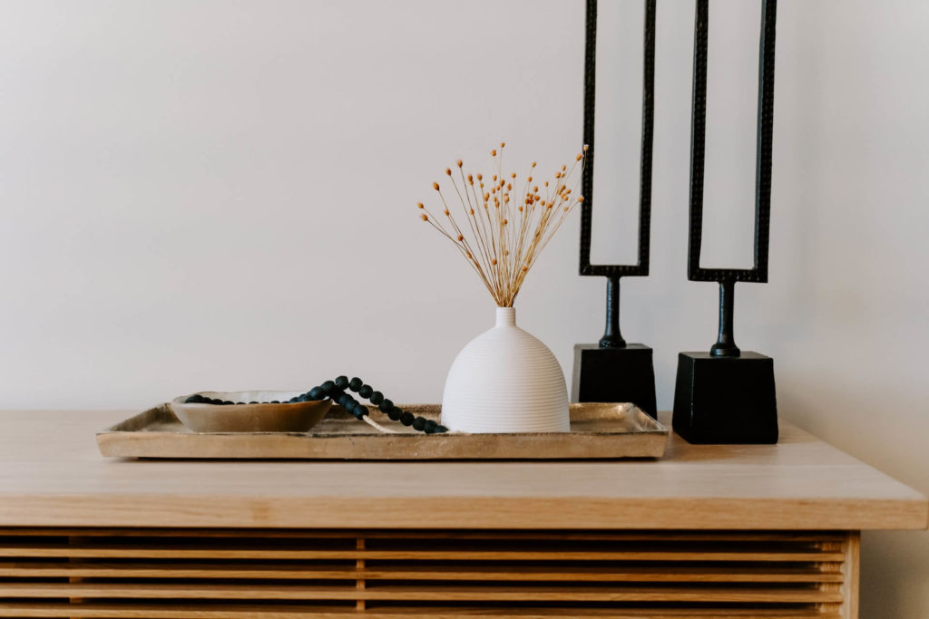 White Ceramic Vase Near two Black Table Decors